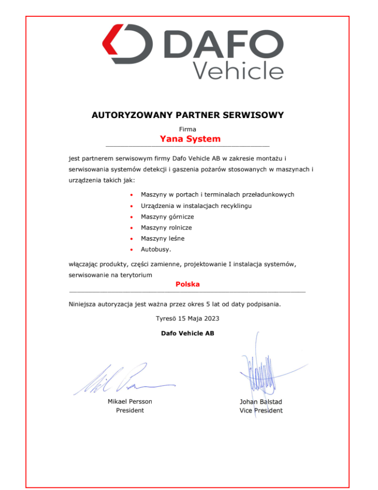 Firma YANA SYSTEM , może pochwalić się bogatym doświadczeniem i wiedzą specjalistyczną, w branży systemów przeciwpożarowych oraz klimatyzacji. To właśnie na tym fundamencie budujemy relacje z naszymi Klientami. Jako autoryzowany partner znanego producenta DAFO VEHICLE będziemy dostarczać, instalować i serwisować nowoczesne urządzenia i rozwiązania, które mają na celu zapewnić maksymalne bezpieczeństwo i ochronę przed zagrożeniami pożarowymi.